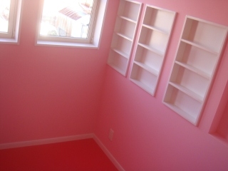 奥様の希望でこちらの二部屋はピンクに。壁紙とやさしい水性塗料で仕上げました。