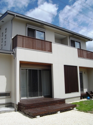 外観は新あぜくら調(塗り壁調)サイディング+無垢板(ヒノキのウッドパネル)と木格子を組み合せて個性的でナチュラルなデザインになりました。