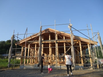 家の中は岐阜県産材の柱や丸太の梁が見える設計で棟上げを行いました。