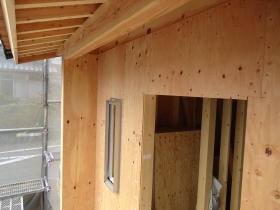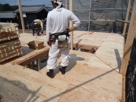 剛床工法は従来の根太工法と違い、梁の間に小梁を組み込んでその上から分厚い構造用合板を張って水平構面の剛性を強くする工法です。面材耐力壁は、外壁の全面に構造用耐力面材(建物を”面”で支えます。)を張ることで耐震性を高めるとともに、気密の確保にも有利な為この工法を取り入れています。そして内部の要所には筋交いを入れます。